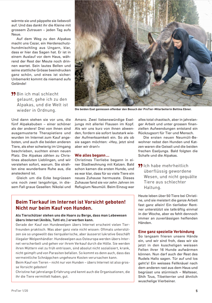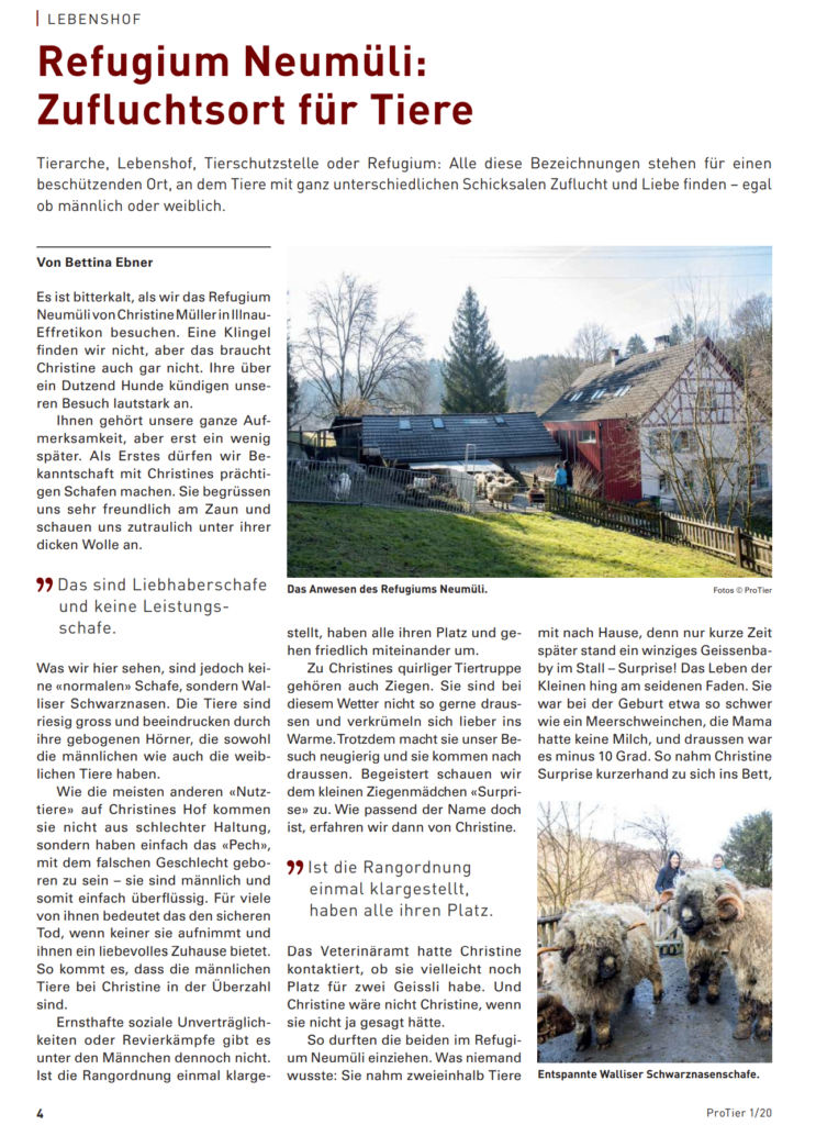 In der Ausgabe 1/2020 des Pro-Tier Magazins erschien ein ausführlicher Bericht über das Refugium Neumüli. Der dreiseitige Beitrag von Bettina Ebner stellt Geschichten von Menschen und Tieren des Refugiums vor und erzählt wie es überhaupt dazu kam, dass mittlerweile über 70 Tiere im Kempttal wohnen. Und Alpaka Celi ist ist enorm stolz das Cover der Ausgabe zieren zu dürfen :-). Den Bericht gibt es hier. Viel Spass beim Lesen!